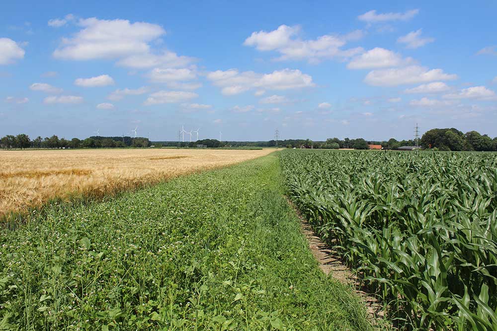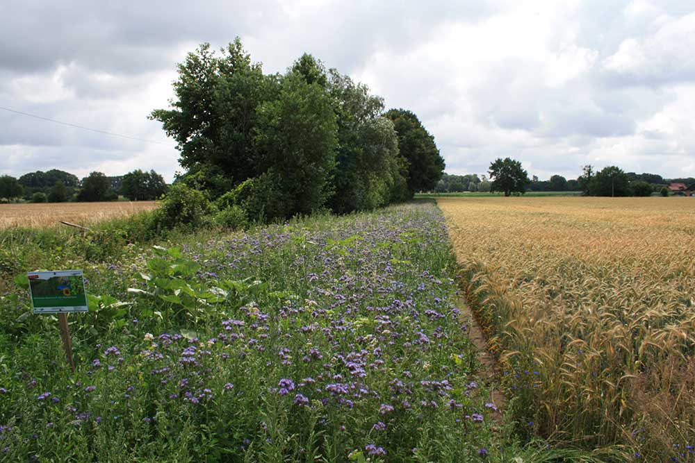 Erstmalig im Jahr 2018 förderte die Stiftung das von der Stiftung Westfälische Kulturlandschaft organisierte Projekt „Blühendes Band“. Ziel war die Schaffung eines Bandes von Blühstreifen auf Ackerflächen im Münsterland in einer Größe von 150 ha. Dazu legten die teilnehmenden Landwirte auf ihren Ackerflächen drei bis sechs Meter breite Blühstreifen an, die aus einer artenreichen Mischung von Kulturpflanzen mit einem langen Blühaspekt bestanden. Ihre pollen- und nektartragenden Blüten stellen eine wichtige Nahrungsquelle für die Flora und Fauna einer offenen Feldflur dar. In den Jahren 2019 und 2020 konnte die Fläche auf Westfalen-Lippe mit Blühstreifen in einer Größe von 800 ha erweitert werden.